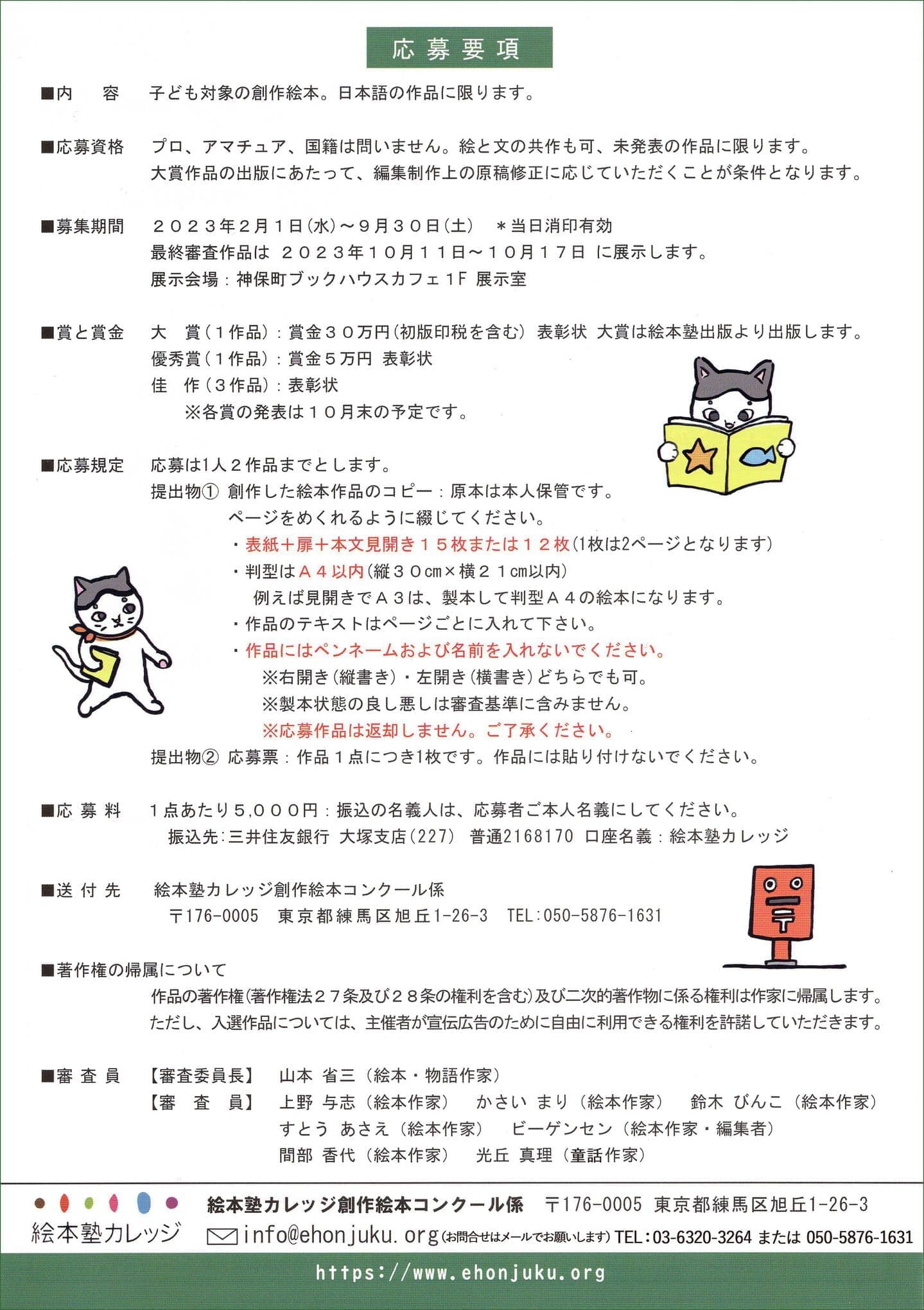 コロナ感染症の流行も少し落ち着き、ようやく様々なイベントが復活の兆しをみせています。そのような中、創作絵本コンクールも審査員半数以上が入れ替わり、心機一転、優れた絵本作家を出版界に送り出すべく、新たな気持ちで選考にあたりました。